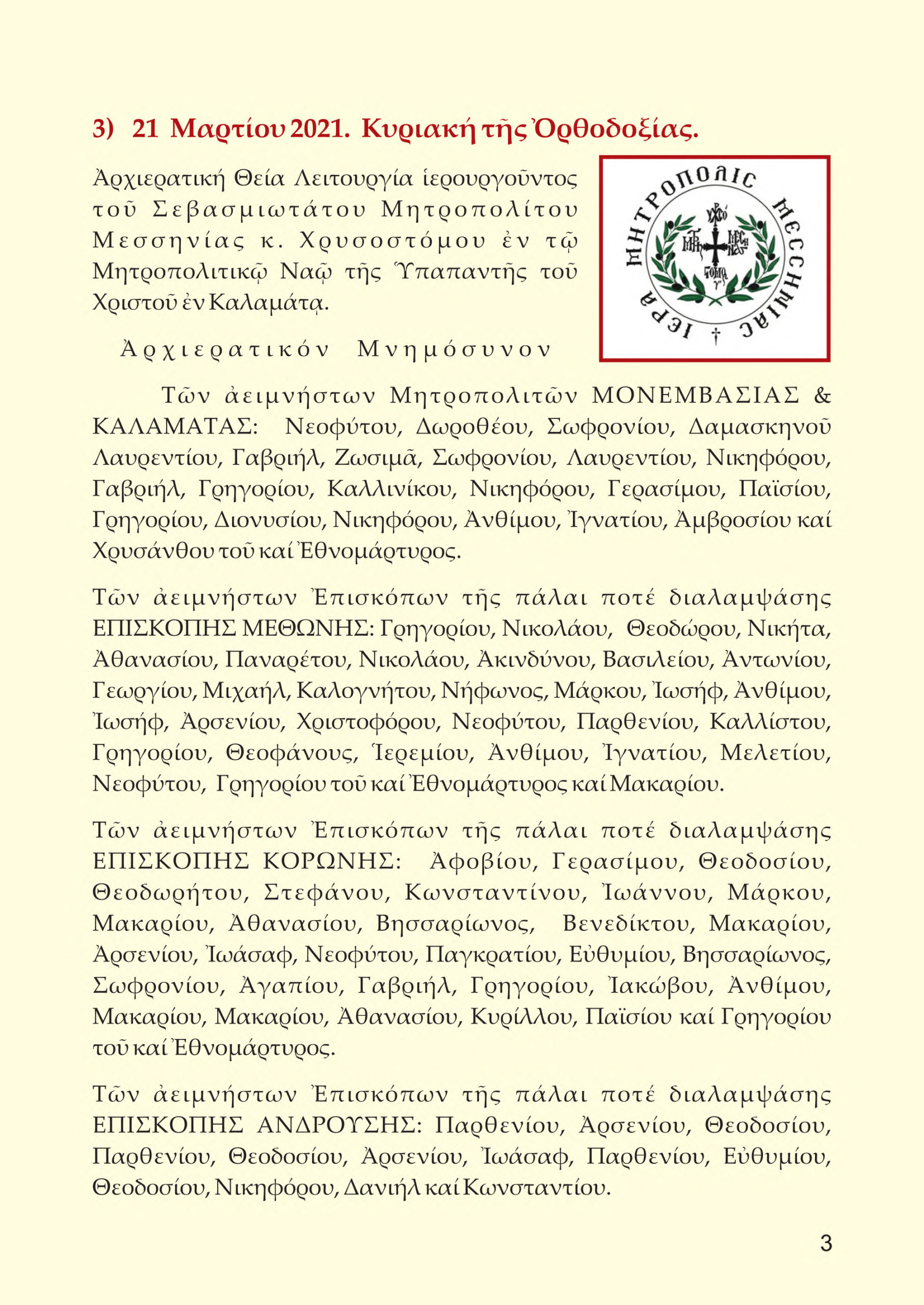 Η Ιερά Μητρόπολις Μεσσηνίας, ως η επαρχία εις την οποίαν έλαβε χώρα η έναρξις της Επαναστάσεως, κατά τήν 23ην Μαρτίου 1821, έχει προγραμματίσει σειράν Επετειακών Εκδηλώσεων, προς τιμήν των ηρώων, των διδάχων του γένους και των προγόνων μας, η έναρξη των οποίων θα γίνει αύριο 3 Ιανουαρίου, Κυριακή προ των Φώτων με δοξολογία στην Ι.Μ. Βελανιδιάς.