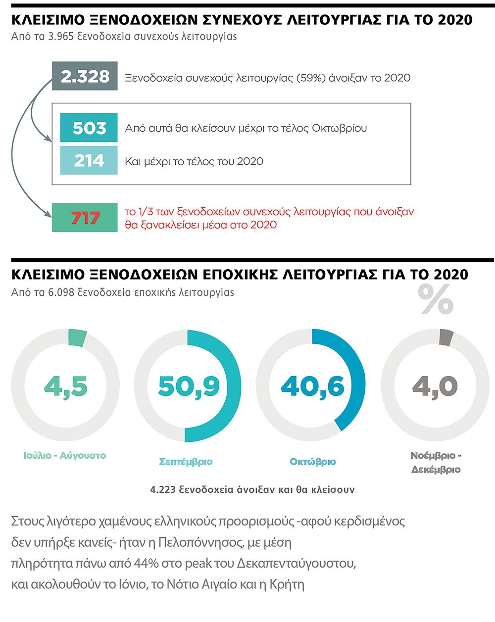 Απολογιστικά, για τη φετινή σεζόν στους λιγότερο χαμένους ελληνικούς προορισμούς -αφού κερδισμένος δεν υπήρξε κανείς- ήταν η Πελοπόννησος, με μέση πληρότητα πάνω από 44% στο peak του Δεκαπενταύγουστου, και ακολουθούν το Ιόνιο, το Νότιο Αιγαίο και η Κρήτη. Συνολικά ανά την Ελλάδα για τον πιο θερμό μήνα του καλοκαιριού η μέση πληρότητα ήταν φέτος σε πρωτοφανή χαμηλά επίπεδα -μόλις 29,8%-, όταν τον Αύγουστο του 2019 άγγιξε το 87%, ξεπερνώντας μάλιστα ακόμη και το 91% στις «πρωταθλήτριες» μονάδες των 4 αστέρων.
