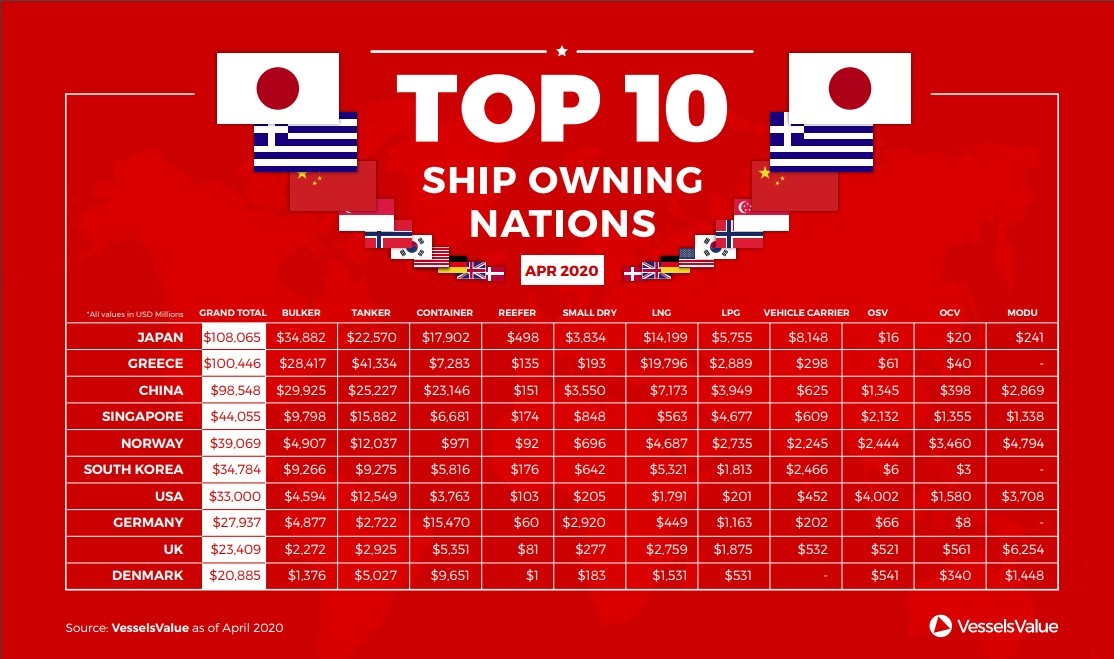 Ο στόλος των Ελλήνων φθάνει τα 100,446 δισεκατομμύρια δολάρια και βρίσκεται στη δεύτερη θέση πίσω από την Ιαπωνία η οποία είναι μεγάλη δύναμη της παγκόσμαις ναυτιλιακής βιομηχανίας.