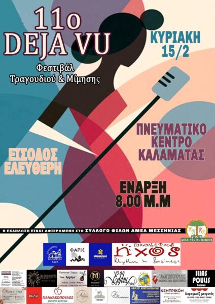 Στις 20:30, στο Πνευματικό Κέντρο Καλαμάτας, ακολουθεί το DEJA VU – Φεστιβάλ τραγουδιού και μίμησης, μια βραδιά γεμάτη μουσική, ταλέντο και εντυπωσιακές εμφανίσεις.