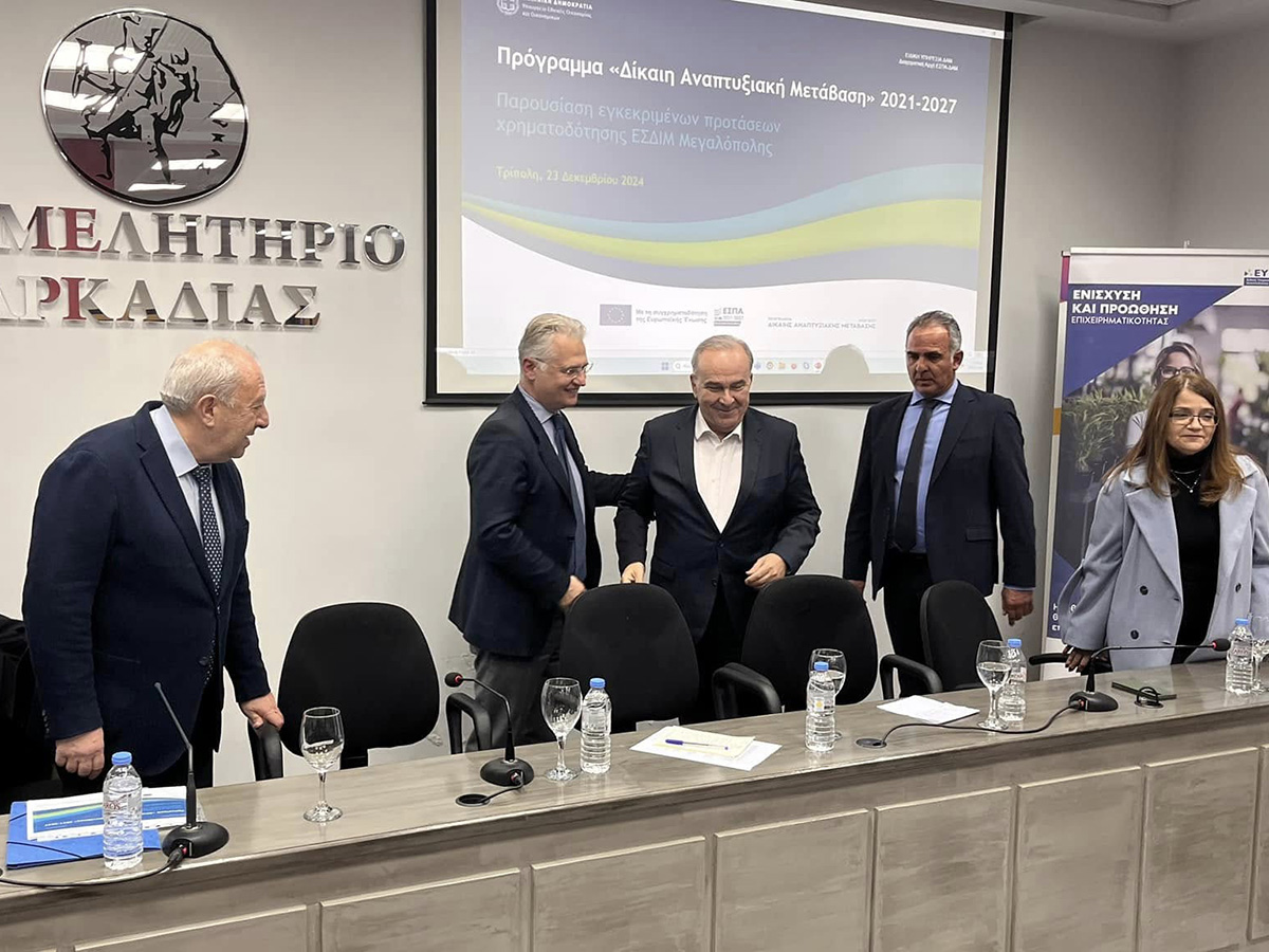 Ο Αναπληρωτής Υπουργός Εθνικής Οικονομίας και Οικονομικών, Νίκος Παπαθανάσης, μαζί με τον Διοικητή της Ειδικής Υπηρεσίας Δίκαιης Αναπτυξιακής Μετάβασης, Πελοπίδα Καλλίρη, παρουσία του Περιφερειάρχη Πελοποννήσου Δημήτρη Πτωχού, ανακοίνωσαν στην Τρίπολη τα συνολικά αποτελέσματα της αξιολόγησης των επενδυτικών σχεδίων που υποβλήθηκαν για τους Δήμους Μεγαλόπολης, Τρίπολης, Γορτυνίας και Οιχαλίας στο πλαίσιο των έξι προσκλήσεων για την ενίσχυση της επιχειρηματικότητας του Προγράμματος της Δίκαιης Αναπτυξιακής Μετάβασης 2021-2027.