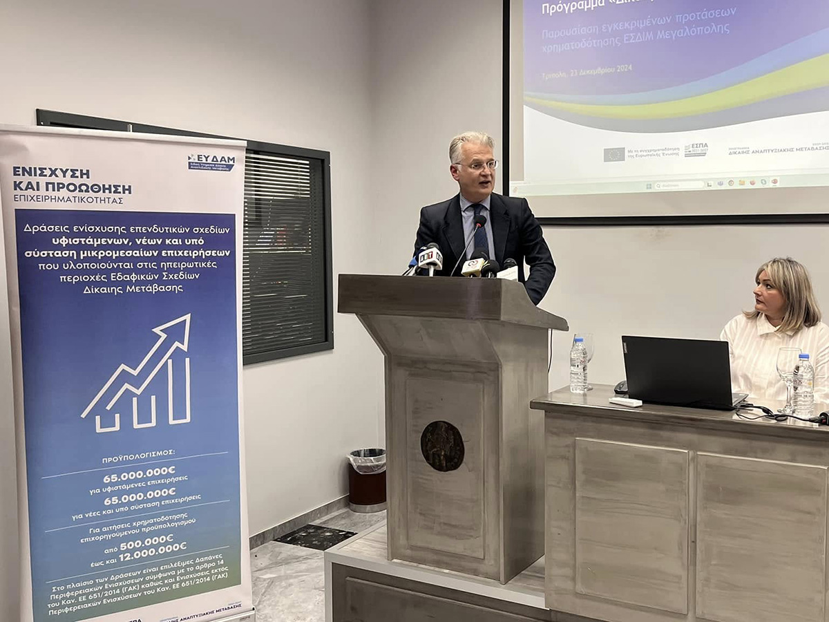 Ο Διοικητής της Ειδικής Υπηρεσίας Δίκαιης Αναπτυξιακής Μετάβασης, Πελοπίδας Καλλίρης, τόνισε: «Η ενεργειακή μετάβαση της χώρας μας θέλουμε να γίνει για τις επηρεαζόμενες περιοχές ευκαιρία για την ανάπτυξη νέων, πιο σύγχρονων και πιο βιώσιμων οικονομικών δραστηριοτήτων. Η σημερινή παρουσίαση των επενδυτικών σχεδίων που εγκρίθηκαν για χρηματοδότηση από το Πρόγραμμα ΔΑΜ στους Δήμους Μεγαλόπολης, Τρίπολης, Γορτυνίας και Οιχαλίας αποτελεί έμπρακτη απόδειξη ότι οι δεσμεύσεις μας γίνονται πράξεις. Το 2025 θα είναι η χρονιά που τα 187 εγκεκριμένα επενδυτικά σχέδια, συνολικού προϋπολογισμού περίπου 110 εκατ. ευρώ, θα αρχίσουν να υλοποιούνται σε αυτές τις περιοχές προσφέροντας μετά την ολοκλήρωσή τους 989 νέες θέσεις εργασίας».