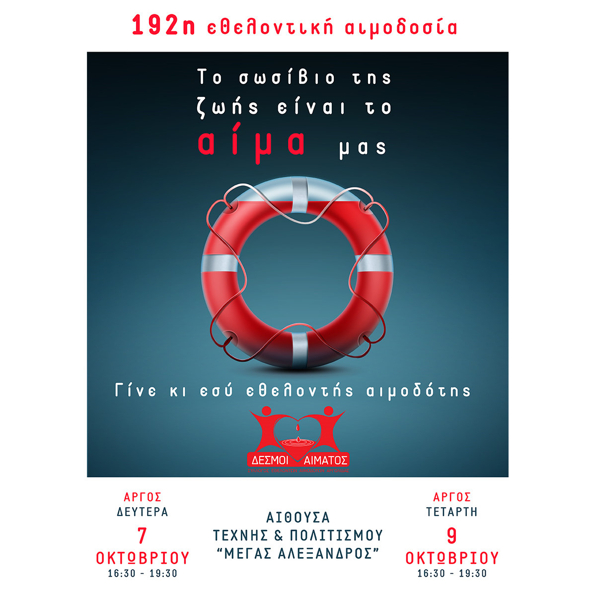Όλοι έχουμε τη δύναμη να γίνουμε ήρωες στις καρδιές αυτών που χρειάζονται. Μια σταγόνα αίματος από εσάς μπορεί να σημαίνει μια ζωή για κάποιον άλλο. Με κάθε αιμοδοσία, δε δίνετε μόνο αίμα, αλλά ελπίδα, δύναμη και θάρρος σε όσους αγωνίζονται για τη ζωή τους.