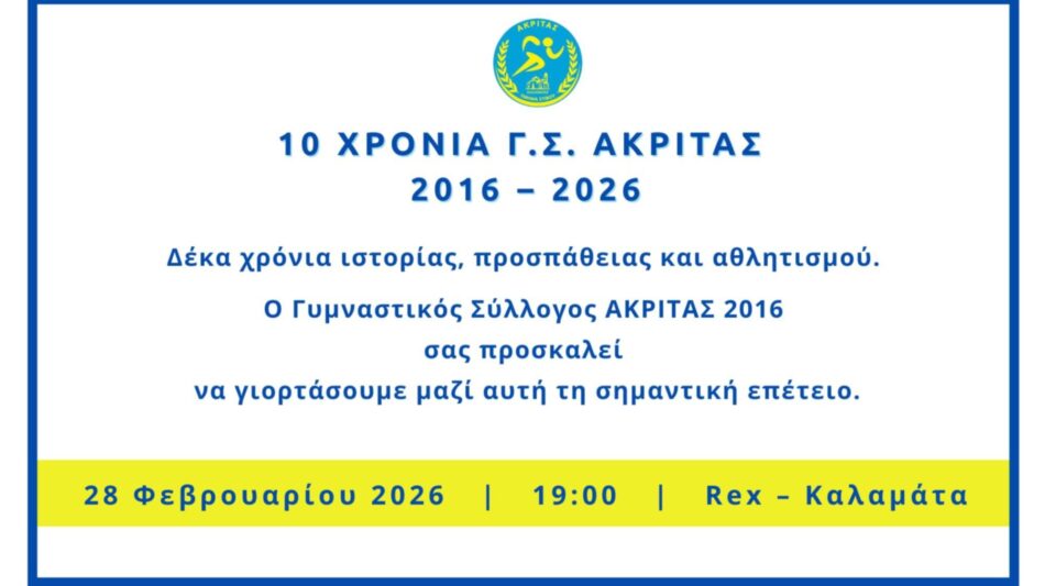 Το σημαντικό αυτό ορόσημο θα γιορταστεί το Σάββατο 28 Φεβρουαρίου, στις 7 μ.μ., στο REX, στην Καλαμάτα, σε μια επετειακή εκδήλωση αφιερωμένη στην πορεία των δέκα αυτών χρόνων. Η βραδιά θα αποτελέσει μια ζωντανή αναδρομή στις στιγμές που σημάδεψαν την ιστορία του συλλόγου, στις επιτυχίες που κατακτήθηκαν με κόπο και επιμονή, αλλά και στο όραμα που συνεχίζει να εμπνέει για το μέλλον.
