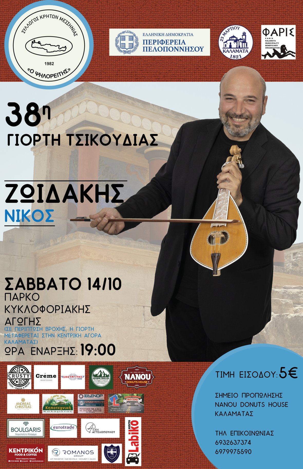 Το Σάββατο 14 Οκτωβρίου, στο Πάρκο Κυκλοφοριακής Αγωγής στην Καλαμάτα, η διασκέδαση ξεκινά από τις 9 το απόγευμα και μέχρι πρωίας με τον γνωστό λυράρη και τραγουδιστή από τα Χανιά, Νίκο Ζωϊδάκη.