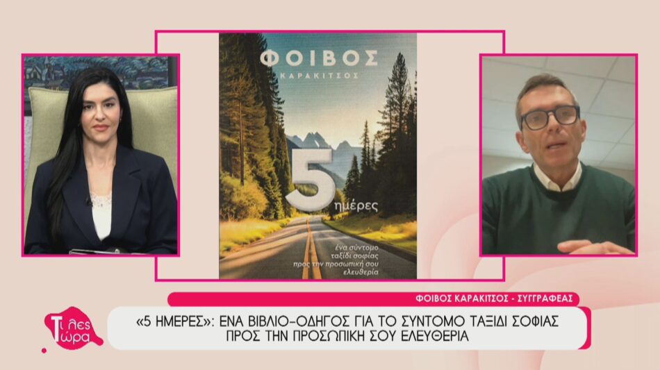 Ο συγγραφέας Φοίβος Καρακίτσος βρέθηκε καλεσμένος στην εκπομπή «Τι Λες Τώρα» με την Αναστασία Μάντζαρη, όπου συζήτησε εκτενώς για το νέο του βιβλίο, «5 ημέρες: Ένα σύντομο ταξίδι σοφίας προς την προσωπική σου ελευθερία». Ο κ. Καρακίτσος τόνισε ότι η ελευθερία είναι ένας εφικτός στόχος και δεν απαιτεί χρόνια αναζήτησης, αλλά μία συνειδητή επιλογή που μπορεί να πραγματοποιηθεί μέσα σε μόλις πέντε ημέρες. Όπως εξήγησε, το μοναδικό ‘εφόδιο’ για να διώξουμε τους φόβους και τις αγωνίες είναι η αγάπη.