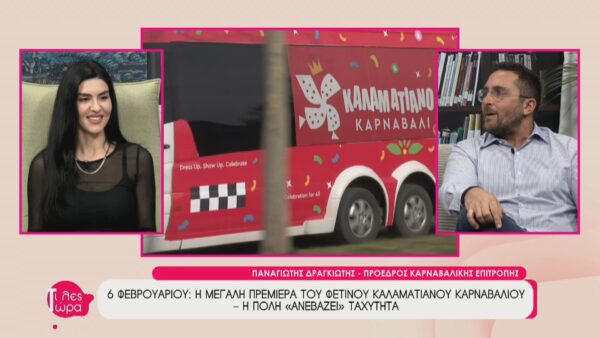 Ο Πρόεδρος της Καρναβαλικής Επιτροπής, Παναγιώτης Δραγκιώτης, βρέθηκε καλεσμένος στην εκπομπή «Τι λες τώρα» με την Αναστασία Μάντζαρη, δίνοντας το σύνθημα για το 13ο Καλαματιανό Καρναβάλι. Κατά τη διάρκεια της συζήτησης, αποκαλύφθηκαν οι προετοιμασίες για τη μεγάλη γιορτή της πόλης που ξεκινά στις 6 Φεβρουαρίου με την τελετή έναρξης και κορυφώνεται στις 22 Φεβρουαρίου. Ιδιαίτερη αναφορά έγινε στην πρωτότυπη συνεργασία με το Αστικό ΚΤΕΛ Καλαμάτας, που μεταφέρει ήδη το καρναβαλικό πνεύμα στους δρόμους της πόλης.
