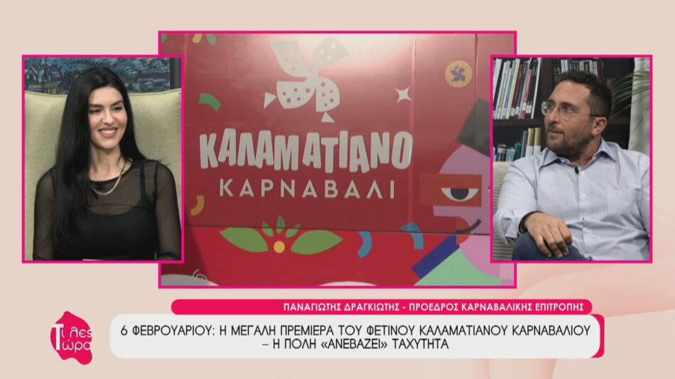 Ο Πρόεδρος της Καρναβαλικής Επιτροπής, Παναγιώτης Δραγκιώτης, βρέθηκε καλεσμένος στην εκπομπή «Τι λες τώρα» με την Αναστασία Μάντζαρη, δίνοντας το σύνθημα για το 13ο Καλαματιανό Καρναβάλι. Κατά τη διάρκεια της συζήτησης, αποκαλύφθηκαν οι προετοιμασίες για τη μεγάλη γιορτή της πόλης που ξεκινά στις 6 Φεβρουαρίου με την τελετή έναρξης και κορυφώνεται στις 22 Φεβρουαρίου. Ιδιαίτερη αναφορά έγινε στην πρωτότυπη συνεργασία με το Αστικό ΚΤΕΛ Καλαμάτας, που μεταφέρει ήδη το καρναβαλικό πνεύμα στους δρόμους της πόλης.