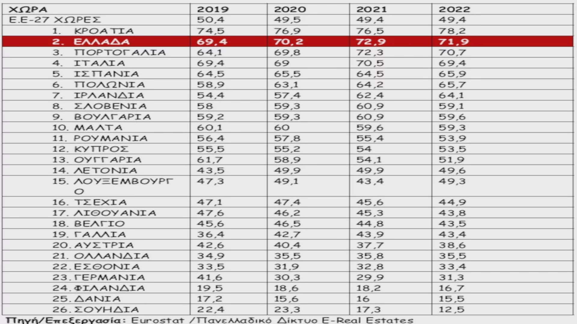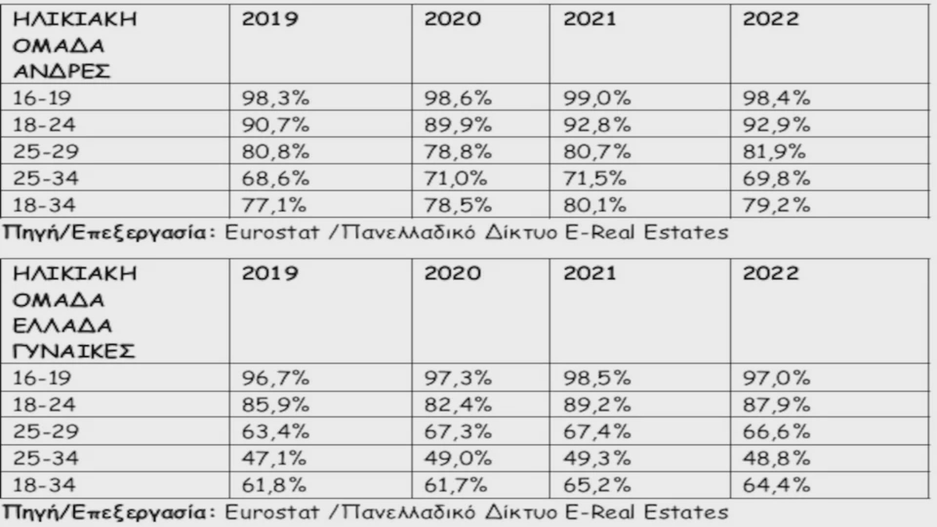 Το ποσοστό των νέων που ζουν με τους γονείς τους, αυξήθηκε κατά 2,5 ποσοστιαίες μονάδες από το 2019 έως το 2022, μειωμένο κατά 1 ποσοστιαία μονάδα σε σχέση με το 2021. «Δεν πρόκειται να φτάσουμε «εύκολα» στο μέσο όρο της Ευρώπης, διότι καταγράφεται μονομερή αύξηση του κόστους στέγασης και διατήρηση των εισοδημάτων σε χαμηλά επίπεδα σε συνάρτηση με τις ανάγκες του σήμερα. Οι πολιτικές στέγασης που εφαρμόζει η πολιτεία δεν εξυπηρετούν επαρκή αριθμό δικαιούχων ώστε να καταγραφεί αισθητή μείωση των νέων που παραμένουν στην οικογενειακή κατοικία», αναφέρει ο πρόεδρος του Πανελλαδικού Κτηματομεσιτικού Δικτύου E- Real Estates, Θεμιστοκλής Μπάκας.