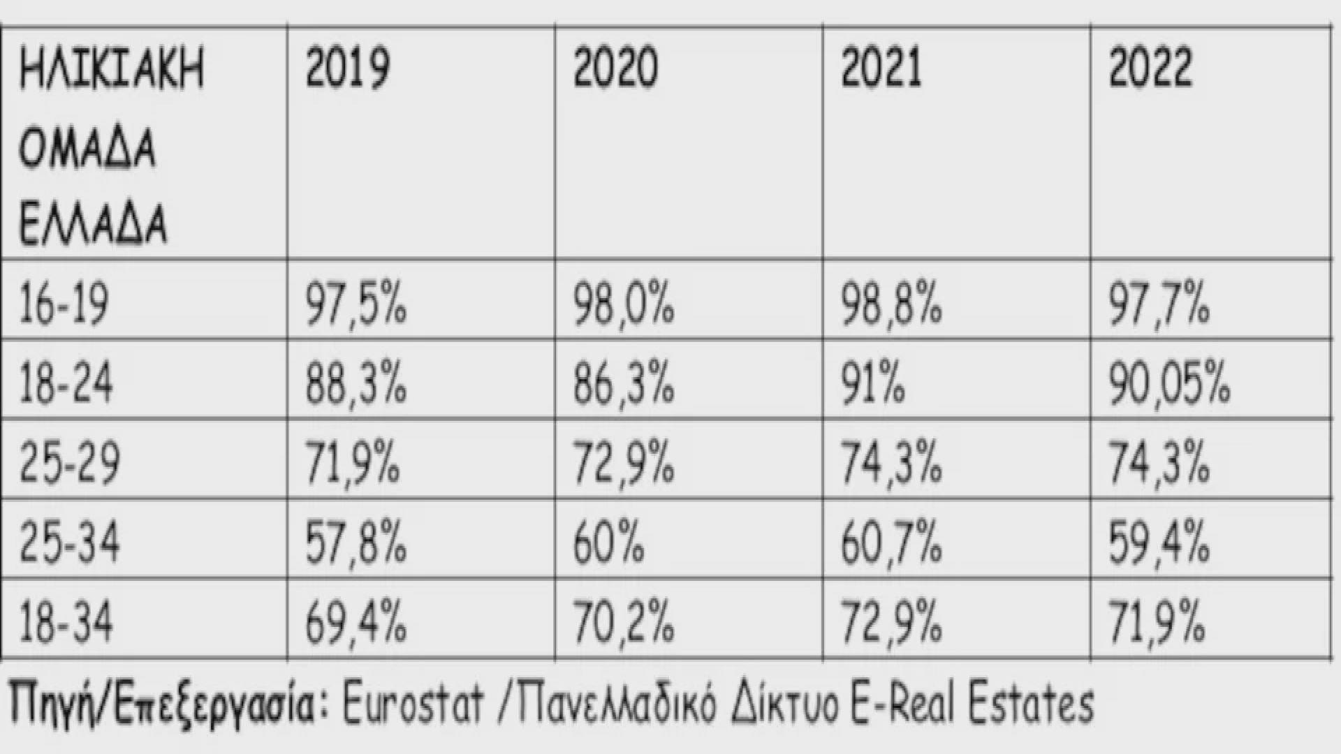 Μάλιστα, το ποσοστό των νέων που διαμένει στο παιδικό του δωμάτιο παραμένει υψηλό όταν επικεντρωνόμαστε στις ηλικίες 25-34, τη στιγμή που σε άλλες χώρες της Ευρώπης περιορίζεται αισθητά, κάτι που σηματοδοτεί μια σημαντική αναβολή στην ομαλή στεγαστική πορεία των νέων ανθρώπων στην Ελλάδα. Η αύξηση του κόστους στέγασης φαίνεται να οδήγησε πολλούς νέους στο να επιλέξουν πανεπιστημιακές σχολές πλησίον της οικογενειακής κατοικίας. Το 90,05% των νέων 18-24 ετών διαμένουν στο παιδικό τους δωμάτιο σύμφωνα με τα στοιχεία της Eurostat.