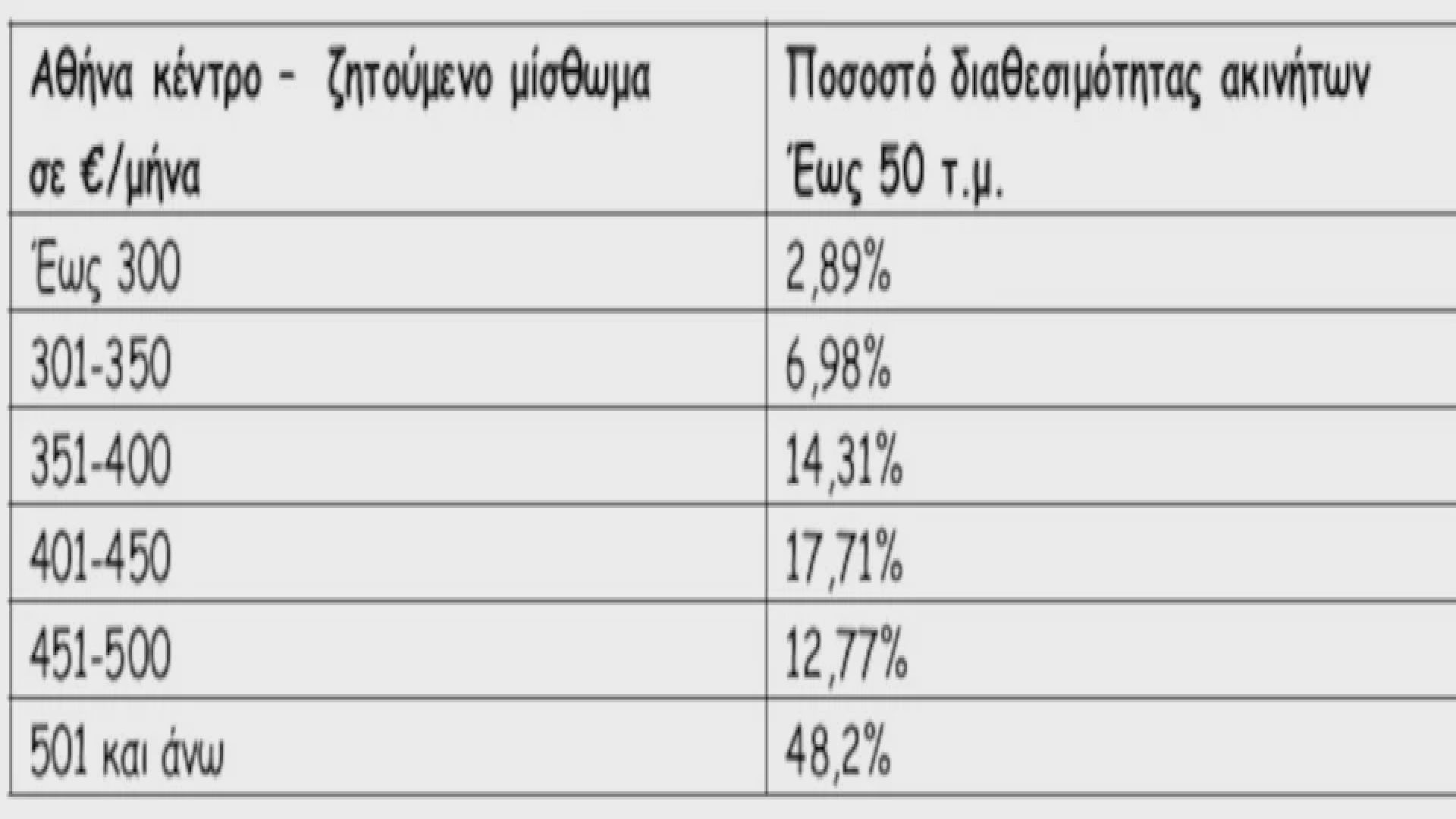 Το κόστος μίσθωσης μιας κατοικίας έως 50τμ, άνω του 1ου ορόφου, κυμαίνεται άνω των 400€ στις περιοχές του κέντρου για το 80% των διαθεσίμων προς μίσθωση κατοικιών, εκ των οποίων το 48,2% έχει ζητούμενο μίσθωμα άνω των 500€/μήνα. «Κατανοούμε ότι το κόστος στέγασης αγγίζει το 60%-70% του μέσου μηνιαίου εισοδήματος, όταν σύμφωνα με τη Eurostat ανεκτό όριο θεωρείται όταν οι στεγαστικές δαπάνες δεν ξεπερνούν το 30% του εισοδήματος. Το ότι οι νέοι εγκαταλείπουν όλο και πιο αργά το πατρικό τους, είναι περισσότερο ανάγκη, παρά επιλογή», εξηγεί ο κ. Μπάκας.