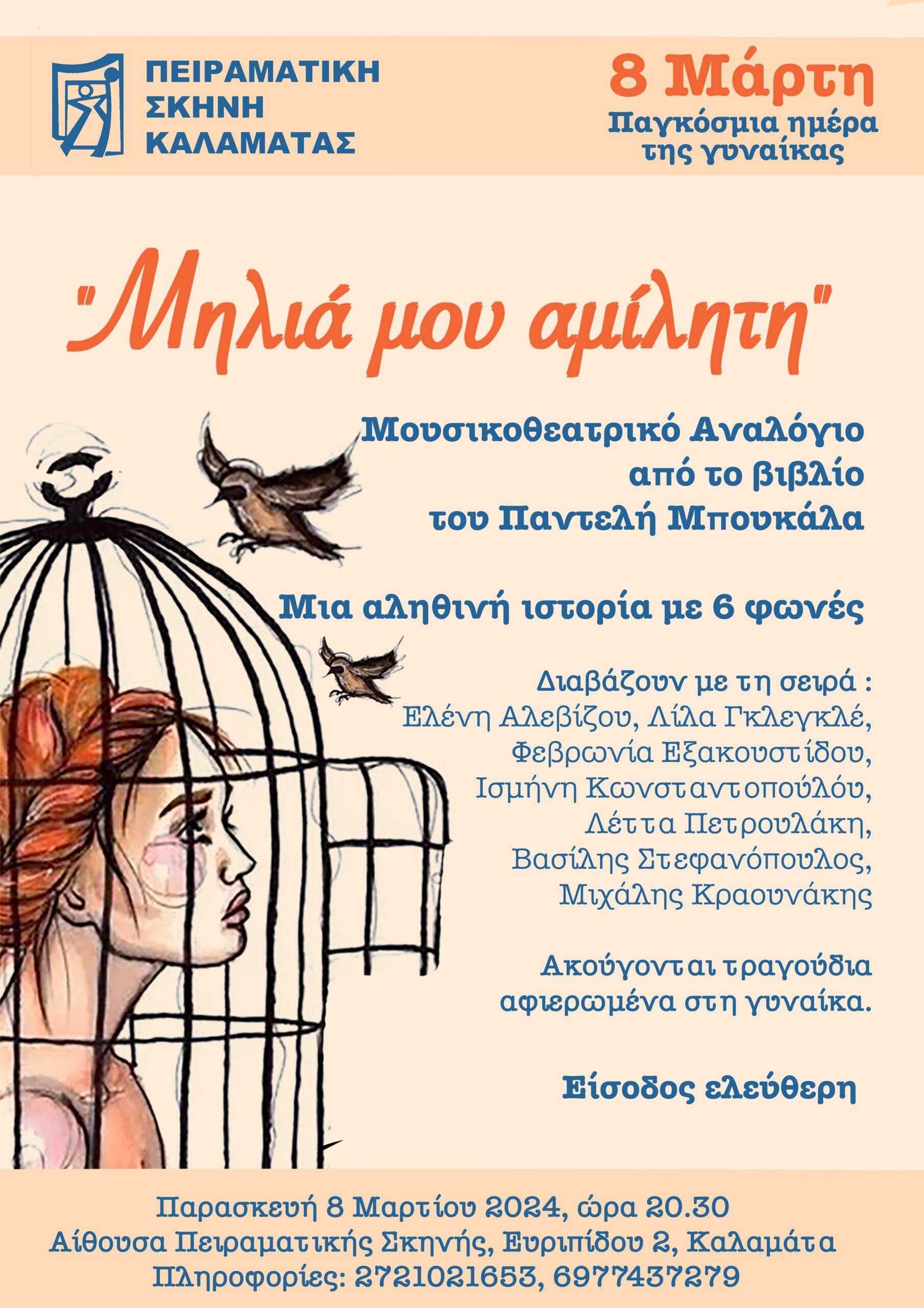 Η Πειραματική Σκηνή Καλαμάτας διοργανώνει την Παρασκευή 8 Μαρτίου, ώρα 20.30 στην Αίθουσα του Συλλόγου Ευριπίδου 2 εκδήλωση με τίτλο: “Μηλιά μου αμίλητη”. Ένα μουσικοθεατρικό αναλόγιο βασισμένο στο βιβλίο του Παντελή Μπουκάλα “Μηλιά μου Αμίλητη”, ΕΝΑΣ ΛΟΓΟΣ ΣΕ ΕΞΙ ΦΩΝΕΣ.