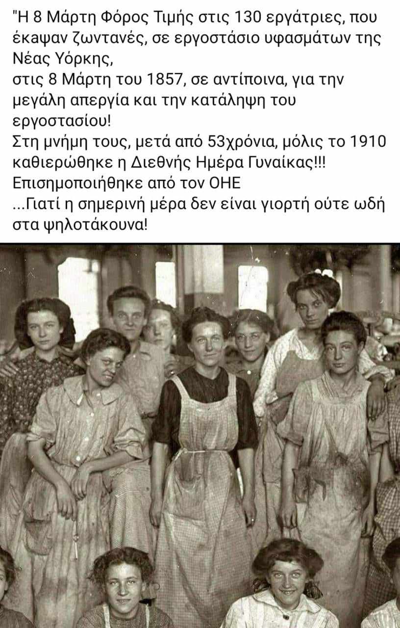 Η 8η Μάρτη φόρος τιμής στις 130 εργάτριες, που έκαψαν ζωντανές, σε εργοστάσιο υφασμάτων της Νέας Υόρκης, στις 8 Μάρτη του 1857, σε αντίποινα για την μεγάλη απεργία και την κατάληψη του εργοστασίου!