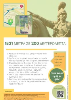 93 βίντεο από 66 σχολεία πρωτοβάθμιας και δευτεροβάθμιας εκπαίδευσης της Π.Δ.Ε. Πελοποννήσου, 864 μαθητές και μαθήτριες, με την υποστήριξη 103 εκπαιδευτικών διαφόρων ειδικοτήτων (στις ομαδικές συμμετοχές), εμπνεύστηκαν, σχεδίασαν και παρέδωσαν τις δημιουργίες τους που αποτυπώνονται σε βίντεο συνολικής διάρκειας άνω των 5 ωρών στο πλαίσιο του περιφερειακού εκπαιδευτικού διαγωνισμού με τίτλο «1821 μέτρα σε 200 δευτερόλεπτα», ο οποίος ολοκληρώθηκε για το τρέχον σχολικό έτος.