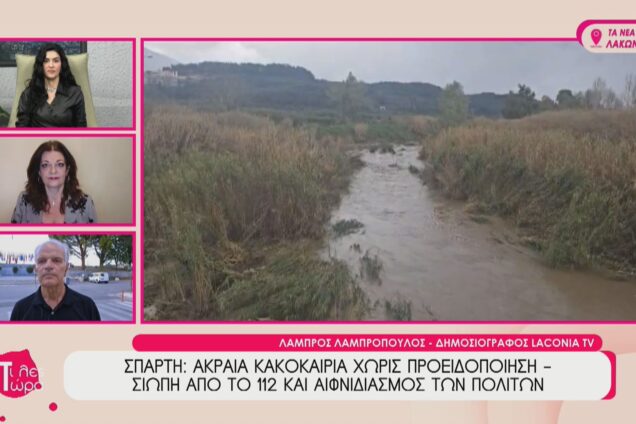 Δείτε τα όσα παρουσιάστηκαν στην ενότητα με τα Νέα της Λακωνίας στην εκπομπή "Τι λες Τώρα". ΣΠΑΡΤΗ: ΑΚΡΑΙΑ ΚΑΚΟΚΑΙΡΙΑ ΧΩΡΙΣ ΠΡΟΕΙΔΟΠΟΙΗΣΗ - ΣΙΩΠΗ ΑΠΟ ΤΟ 112 ΚΑΙ ΑΙΦΝΙΔΙΑΣΜΟΣ ΤΩΝ ΠΟΛΙΤΩΝ Χαρακτηριστική ήταν η παρέμβαση του Λάμπρου Λαμπρόπουλο, δημοσιογράφος Laconia TV https://youtu.be/XA93yI8OF-k?t=5800