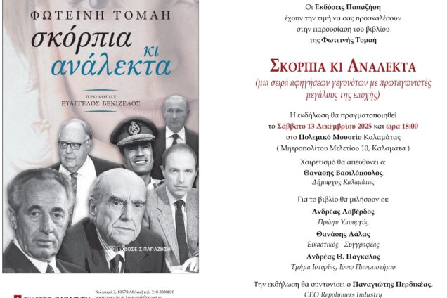Μια σειρά αφηγήσεων γεγονότων με πρωταγωνιστές μεγάλους της εποχής παρουσιάζοντας στις σελίδες του βιβλίου της Φωτεινής Τομαή «Σκόρπια κι Ανάλεκτα», το οποίο οι εκδόσεις Παπαζήση συστήνουν στο κοινό αυτό το Σάββατο 13 Δεκεμβρίου στην Καλαμάτα, Χαιρετισμό θα απευθύνει ο Θανάσης Βασιλόπουλος
