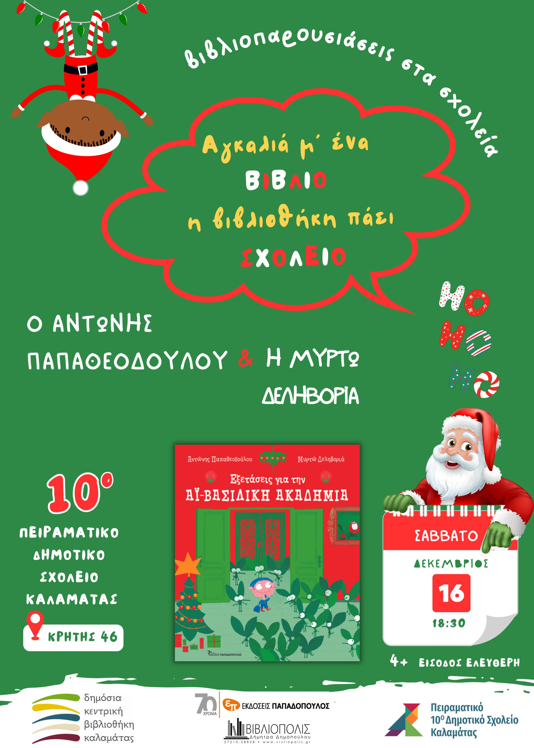 Το Σάββατο 16 Δεκεμβρίου, στις 18:30 θα υποδεχτούμε τον συγγραφέα Αντώνη Παπαθεοδούλου και την εικονογράφο Μυρτώ Δεληβοριά για να μας παρουσιάσουν το νέο τους βιβλίο με τίτλο «Εξετάσεις για την Αϊ Βασιλική Ακαδημία» από τις εκδόσεις Παπαδόπουλος. Η παρουσίαση θα πραγματοποιηθεί στο 10ο Πειραματικό Δημοτικό Σχολείο Καλαμάτας (Κρήτης 46) σε συνεργασία με το βιβλιοπωλείο Βιβλιόπολις. Η είσοδος είναι ελεύθερη για παιδιά ετών 4+, γονείς, δασκάλους και όσους, μικρούς και μεγάλους, αγαπούν τα βιβλία.