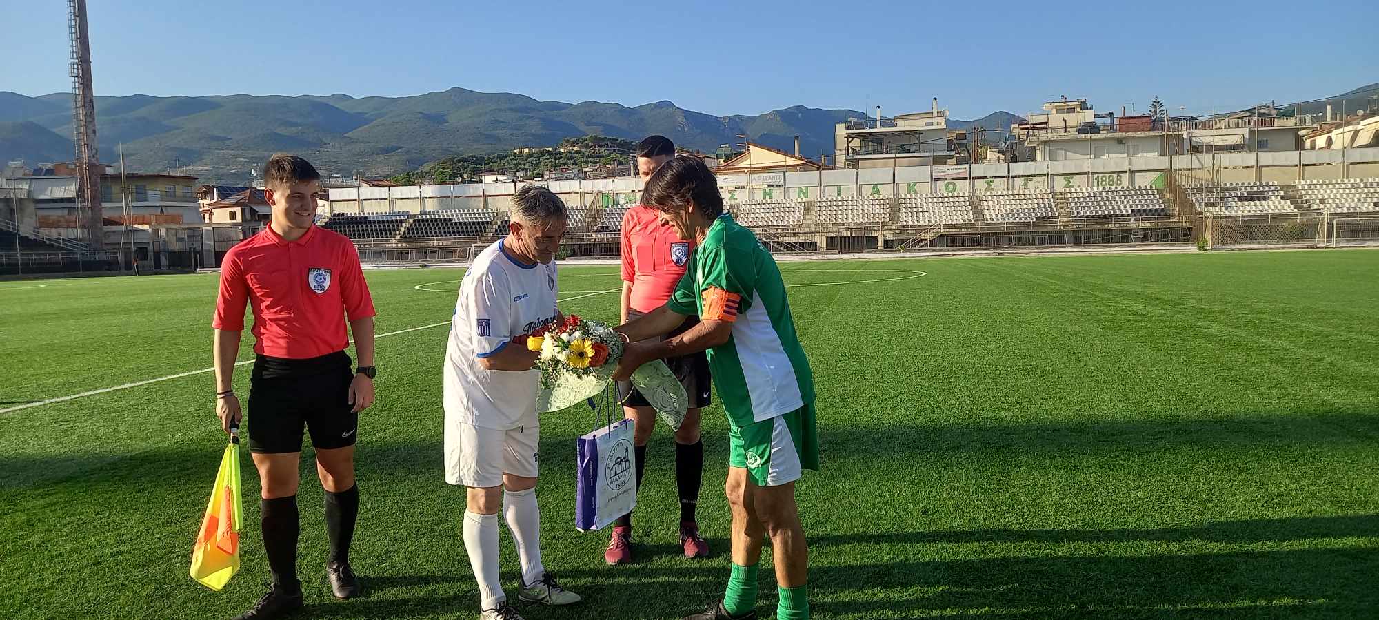 Της απονομής στο τιμώμενο πρόσωπο του αγώνα φιλίας, προηγήθηκε το καλωσόρισμα και οι ευχές προς τους παλαίμαχους της Πάτρας από τον αντιπρόεδρο του Μεσσηνιακού Γυμναστικού Συλλόγου, Σταύρο Χριστόπουλου, ο οποίος στάθηκε στο ανθρώπινο σκέλος αυτής της πρωτοβουλίας λέγοντας πως πάνω απ΄ όλα «…είμαστε φίλοι από τα παλιά. Παλιοί αντίπαλοι μεν, αλλά πάντοτε φίλοι. Τώρα παίζουμε καλύτερα από τότε. Εύχομαι σε όλους υγεία και να βρισκόμαστε να κάνουμε αγώνες».