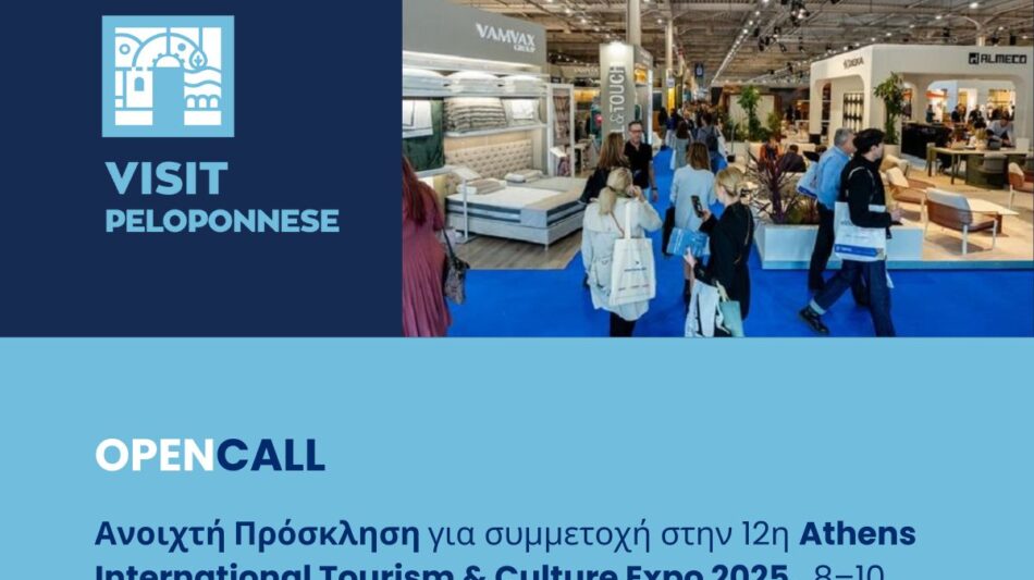 Η Περιφέρεια Πελοποννήσου πρόκειται να συμμετάσχει στην 12η Athens International Tourism & Culture Expo 2025, η οποία θα πραγματοποιηθεί στο Ζάππειο Μέγαρο από τις 8 έως τις 10 Δεκεμβρίου 2025, και απευθύνει ανοιχτή πρόσκληση προς τουριστικούς φορείς και επαγγελματίες της Πελοποννήσου που επιθυμούν να λάβουν μέρος ως Συνεκθέτες.