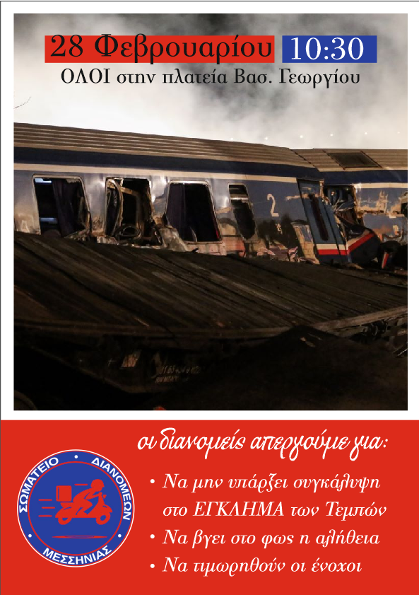 Σύμφωνα με την ανακοίνωση: “Το Σωματείο Διανομέων Μεσσηνίας κηρύσσει 24ωρη απεργία την Παρασκευή 28 Φεβρουαρίου 2025 για την συμπλήρωση δύο χρόνων από την τραγωδία των Τεμπών. Συμμετέχουμε όλοι, ενώνουμε δυνάμεις και δίνουμε παρών στις 10:30 το πρωί στην κεντρική πλατεία Καλαμάτας. Το σύνθημα μας είναι ένα: Να μην υπάρχει συγκάλυψη στο έγκλημα των Τεμπών, να βγει στο φως η αλήθεια, να τιμωρηθούν οι ένοχοι.