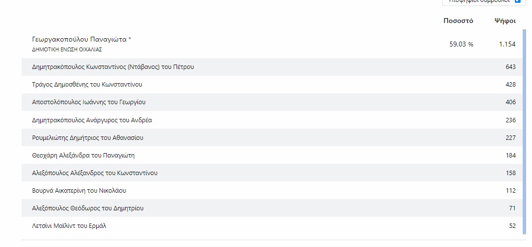 Από την πρώτη Κυριακή η Παναγιώτα Γεωργακοπούλου έλαβε την εμπιστοσύνη της πλειοψηφίας των πολιτών στο δήμο Οιχαλίας, όπου η «Δημοτική Ένωση Οιχαλίας» με την ενσωμάτωση στο 100% έλαβε το εντυπωσιακό 51,79%. Με 5.037 ψήφους και 11 έδρες η νυν δήμαρχος συνεχίζει το έργο της στο δήμο.