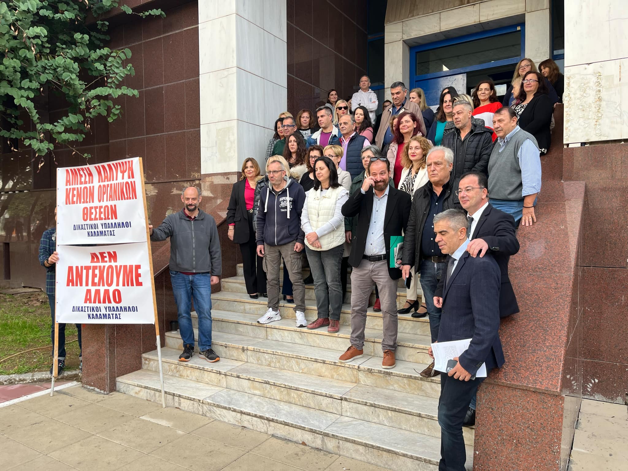 Δικηγόροι και δικαστικοί υπάλληλοι στην Καλαμάτα απέχουν σήμερα από τα καθήκοντά τους και από κάθε δικαστική και εξώδικη ενέργεια συμπεριλαμβανομένης της σύνταξης και υπογραφής πάσης φύσεως ιδιωτικών συμφωνητικών, Καλαμάτας διαμαρτυρόμενοι για τις κενές οργανικές θέσεις στις δικαστικές υπηρεσίες.