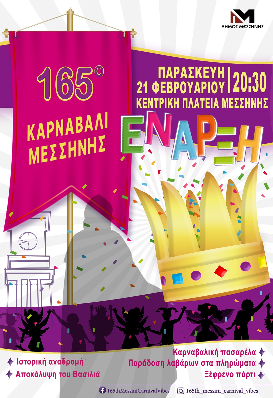 20:30 Τελετή Έναρξης «165ου Καρναβαλιού Μεσσήνης» στην Κεντρική πλατεία Μεσσήνης.