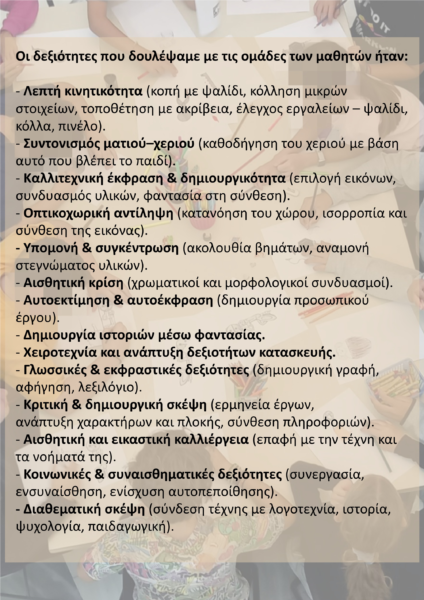 Στα εργαστήρια, οι ομάδες ήρθαν σε επαφή με τη σύγχρονη ελληνική καλλιτεχνική δημιουργία, καλλιέργησαν την αισθητική τους αντίληψη και δούλεψαν την ικανότητα κατανόησης και ερμηνείας έργων τέχνης. Μέσα από τη βιωματική επαφή με τα εκθέματα, οι μαθητές ενθαρρύνθηκαν να εκφράσουν τα συναισθήματα τους, ενώ παράλληλα ενισχύθηκε η δημιουργική τους σκέψη. Με την ενεργή συμμετοχή τους, τα παιδιά πειραματίστηκαν με διάφορες τεχνικές, καλλιέργησαν τη φαντασία τους και εκφράστηκαν καλλιτεχνικά, ενισχύοντας ταυτόχρονα δεξιότητες συνεργασίας, παρατήρησης και δημιουργικής επίλυσης προβλημάτων. Παράλληλα, τα εργαστήρια προέβαλαν την οικολογική συνείδηση μέσα από την επαναχρησιμοποίηση και ανακύκλωση υλικών με τρόπο ευχάριστο και παιγνιώδη.