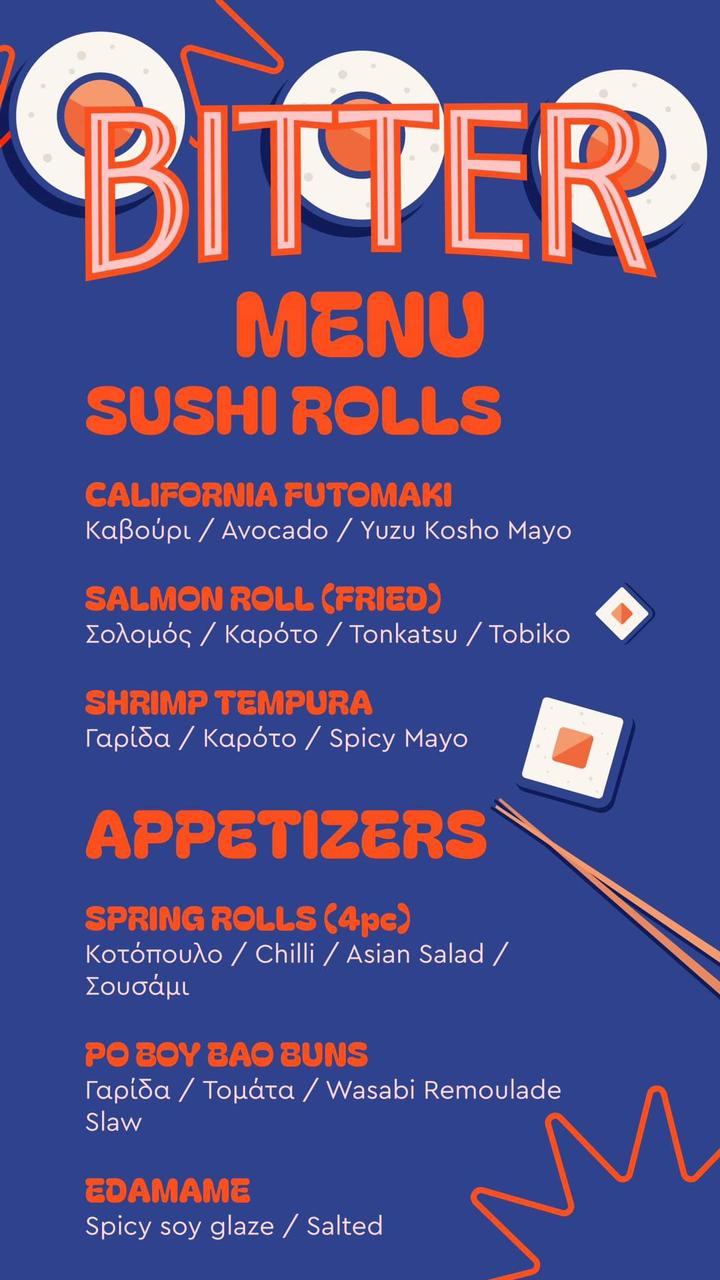 Το Bitter στρώνει τραπέζι γεμάτο αρώματα και γεύσεις από την Ανατολή. Στο μενού πρωταγωνιστούν οι sushi προτάσεις του σεφ του αγαπημένου bar restaurant της πόλης.