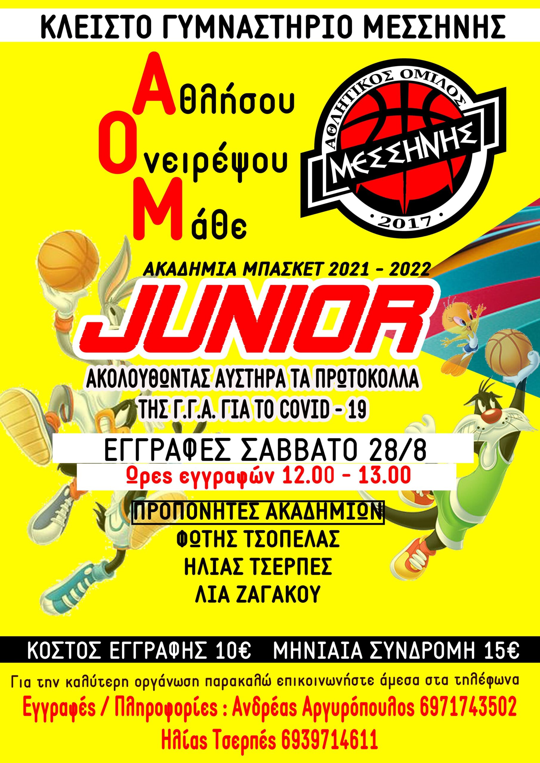 Αρχής γενομένης από το Σάββατο, 28 Αυγούστου, οι εγγραφές στην ακαδημία μπάσκετ junior του Α.Ο. Μεσσήνης ξεκινούν με τους ιθύνοντες του συλλόγου να προετοιμάζουν μια χρονιά γεμάτη αθλητικές συγκινήσεις.