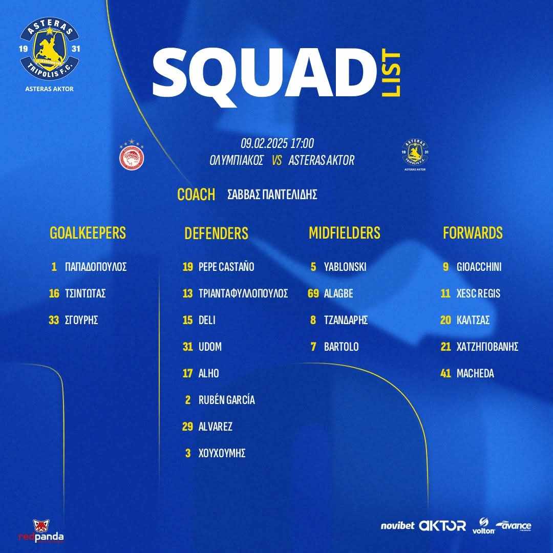 Η αποστολή του Asteras Aktor για τον αυριανό αγώνα (9/2, 17.00) πρωταθλήματος αποτελείται από τους: Παπαδόπουλο, Τσιντώτα, Σγουρή, Pepe Castano, Χουχούμη, Τριανταφυλλόπουλο, Deli, Alho, Udom, Ruben Gacia, Alvarez, Yablonski, Alagbe, Τζανδάρη, Bartolo, Regis, Καλτσά, Χατζηγιοβάνη, Macheda, Gioacchini.