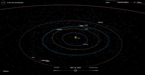 Στην εφαρμογή Eyes on Asteroids, ο χρήστης μπορεί να δει την θέση των απειλητικών αστεροειδών τόσο στο παρόν όσο και στο παρελθόν και το μέλλον.