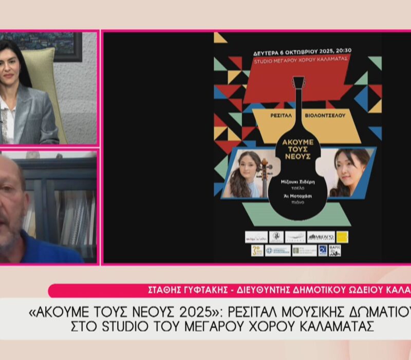Ο Διευθυντής του Δημοτικού Ωδείου Καλαμάτας, Στάθης Γυφτάκης, ήταν καλεσμένος στην εκπομπή «Τι Λες Τώρα» με την Αναστασία Μάντζαρη (καθημερινά 17:00-19:00), όπου συζήτησε για ρεσιτάλ μουσικής δωματίου στο studio του Μεγάρου Χορού Καλαμάτας, τις προσεχείς δράσεις και το όραμα του