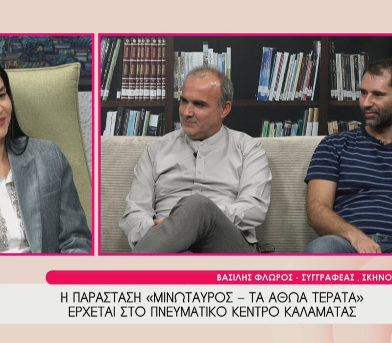 Ο συγγραφέας-σκηνοθέτης Βασίλης Φλώρος και ο ηθοποιός Παναγιώτης Καραμπέτσος ήταν καλεσμένοι στην εκπομπή «Τι Λες Τώρα» με την Αναστασία Μάντζαρη (17:00-19:00). Μίλησαν για την παράσταση «Μινώταυρος – Τα αθώα τέρατα» και την ανατροπή του κλασικού μύθου. https://youtu.be/Ur_xbThwpvA?t=5740