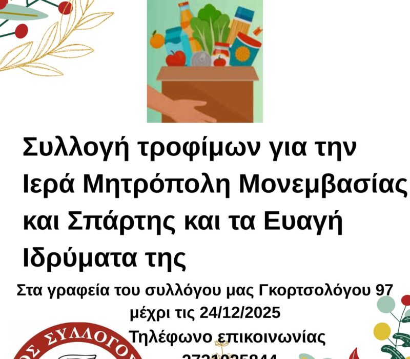 Ο Εμπορικός Σύλλογος Σπάρτης σε πνεύμα αλληλεγγύης και εν όψει των εορτών των Χριστουγέννων προχωρά σε συλλογή τροφίμων. Σε ανακοίνωσή του αναφέρει: Με αφορμή το πνεύμα των Χριστουγέννων και τις γιορτές που πλησιάζουν, ο Εμπορικός Σύλλογος Σπάρτης διοργανώνει για ακόμη μία χρονιά