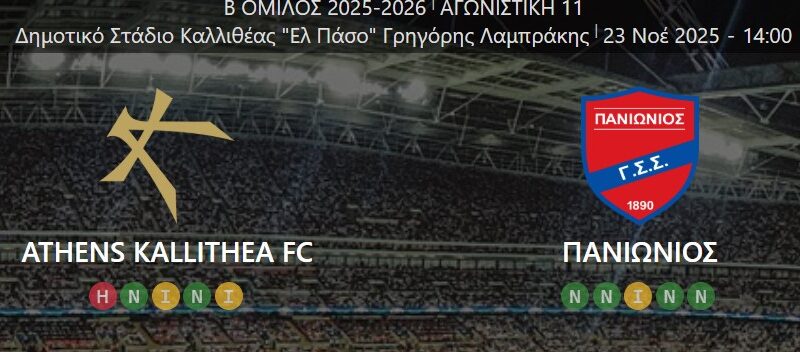 Καλλιθέα και Πανιώνιος διασταυρώνουν τα ξίφη τους στο ντέρμπι της 11ης αγωνιστικής για τον Νότιο όμιλο της Super League II. Όπως κάθε Κυριακή έτσι και αυτή, η ποδοσφαιρική δράση εξελίσσεται επί της οθόνης. Το ματς της Κυριακής (23/11, ώρα στις 14:00)