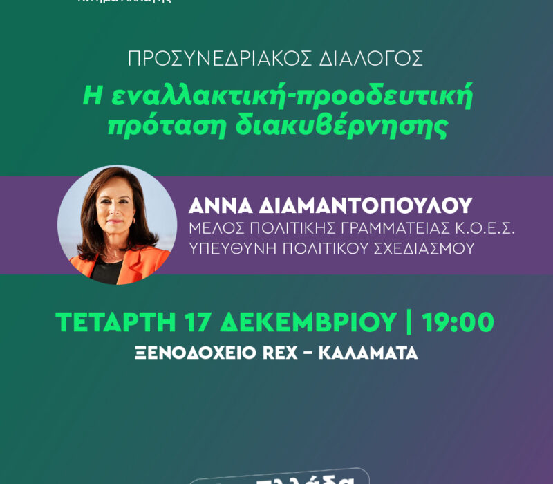 Η Νομαρχιακή Επιτροπή Μεσσηνίας του ΠΑΣΟΚ – Κινήματος Αλλαγής, στο πλαίσιο του Προσυνεδριακού Διαλόγου, σας προσκαλεί σε εκδήλωση αυτήν την Τετάρτη 17 Δεκεμβρίου 2025 και ώρα 19:00, στο ξενοδοχείο REX στην Καλαμάτα (Αριστομένους 26), πλησίον του Ιστορικού Δημαρχείου), με θέμα: «Η εναλλακτική – προοδευτική πρόταση διακυβέρνησης» Ομιλήτρια θα