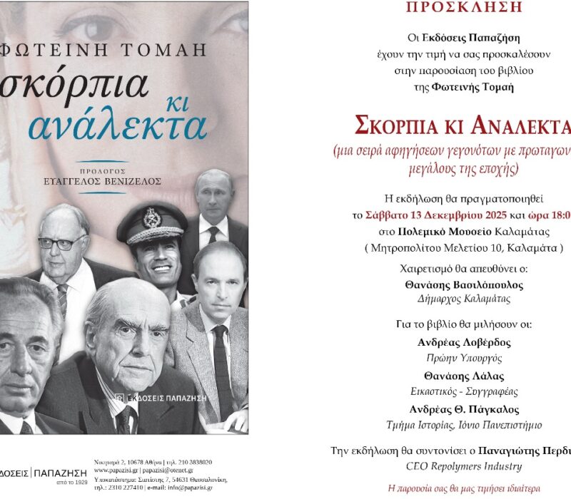Μια σειρά αφηγήσεων γεγονότων με πρωταγωνιστές μεγάλους της εποχής παρουσιάζοντας στις σελίδες του βιβλίου της Φωτεινής Τομαή «Σκόρπια κι Ανάλεκτα», το οποίο οι εκδόσεις Παπαζήση συστήνουν στο κοινό αυτό το Σάββατο 13 Δεκεμβρίου στην Καλαμάτα, Χαιρετισμό θα απευθύνει ο Θανάσης Βασιλόπουλος