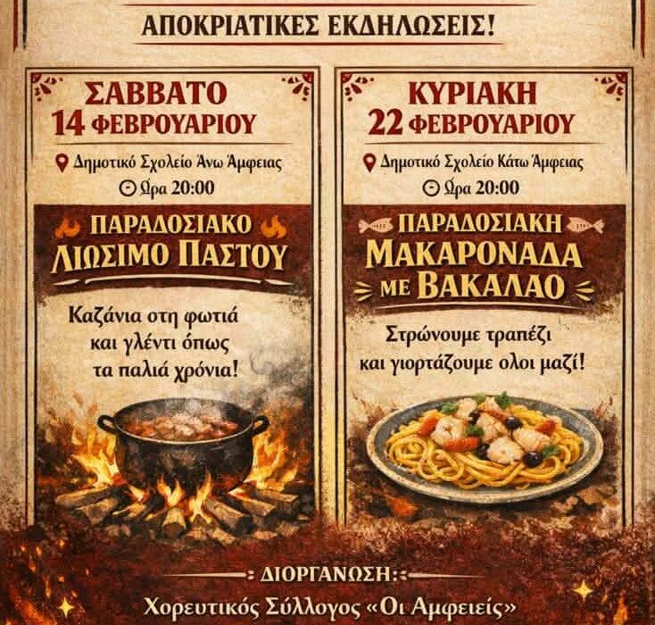 Σήμερα, Σάββατο 14 Φεβρουαρίου 2026 και ώρα 20:00 στο Δημοτικό Σχολείο Άνω Άμφειας θα πραγματοποιηθεί παραδοσιακό λιώσιμο παστού, ενώ την Κυριακή 22 Φεβρουαρίου και ώρα 20:00 στο Δημοτικό Σχολείο Κάτω Άμφειας ντόπιοι και επισκέπτες θα έχουν τη δυνατότητα να δοκιμάσουν