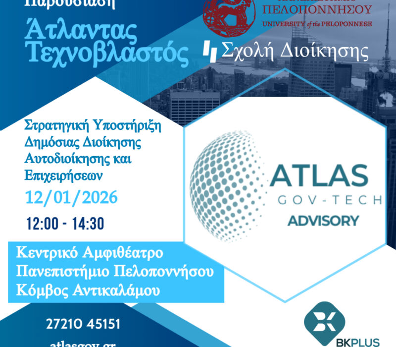 Σήμερα Δευτέρα, 12 Ιανουαρίου 2026, ώρα 12:00 – 14:30, η Σχολή Διοίκησης στο Κεντρικό Αμφιθέατρο του Πανεπιστημίου Πελοποννήσου (Κόμβος Αντικαλάμου), πραγματοποιεί την «Παρουσίαση του Τεχνοβλαστού ATLAS GovTech Advisory του Πανεπιστημίου Πελοποννήσου – Η σημασία για τη σύνδεση της ακαδημαϊκής έρευνας με