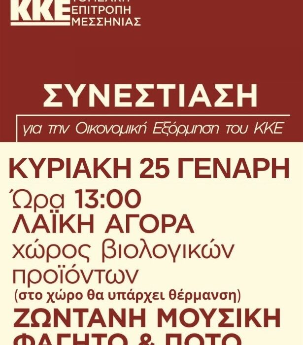 Η Τ.Ε. Μεσσηνίας του ΚΚΕ διοργανώνει γλέντι - συνεστίαση, στα πλαίσια της Οικονομικής Ενίσχυσης του ΚΚΕ, την Κυριακή 25 Γενάρη 2026, στη 1 μ.μ., στην λαϊκή αγορά - χώρος βιολογικών προϊόντων (θα υπάρχει θέρμανση). Θα μιλήσει ο Νίκος Κουτουμάνος, μέλος της ΚΕ του