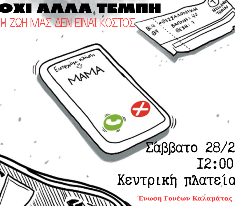 Τέμπη: 3 χρονιά μετά | Συγκέντρωση στην κεντρική πλατεία Καλαμάτας στις 28 Φεβρουαρίου – Σε μαζική συμμετοχή καλεί η Ένωση Συλλόγων Γονέων