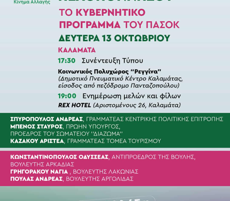 Το ΠΑΣΟΚ – Κίνημα Αλλαγής σας προσκαλεί τη Δευτέρα 13 Οκτωβρίου 2025 και ώρα 19:00, στο Rex Hotel (Αριστομένους 26, Καλαμάτα), σε ανοιχτή εκδήλωση ενημέρωσης μελών και φίλων, στο πλαίσιο της παρουσίασης του Κυβερνητικού Προγράμματος του ΠΑΣΟΚ στην Περιφέρεια Πελοποννήσου. Στην εκδήλωση θα μιλήσουν: Ανδρέας Σπυρόπουλος,