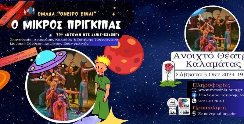 Ο Σύλλογος Εστίασης Μεσσηνίας - MESSINIA FORUM συστήνει στην Καλαμάτα την μικτή συμπεριληπτική ομάδα «Όνειρο είναι» και την παράσταση "Ο ΜΙΚΡΟΣ ΠΡΙΓΚΙΠΑΣ" του Αντουάν ντε Σαιντ-Εξυπερύ το Σάββατο 5 Οκτωβρίου και ώρα 19:30. Η παράσταση θα δοθεί στο Νέο Ανοιχτό