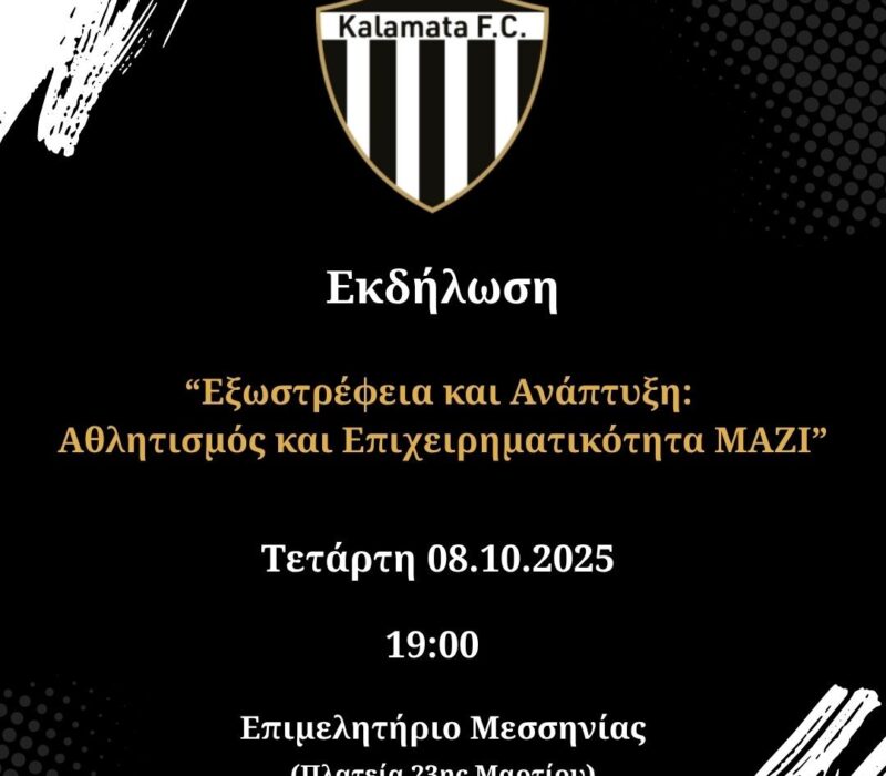 Η ΠΑΕ Καλαμάτα, αναγνωρίζοντας τον σημαντικό ρόλο που διαδραματίζει η τοπική επιχειρηματική κοινότητα στην ανάπτυξη και την προβολή του τόπου μας, σας προσκαλεί σε ανοιχτή εκδήλωση με θέμα: “Εξωστρέφεια και Ανάπτυξη: Αθλητισμός και Επιχειρηματικότητα ΜΑΖΙ” Η εκδήλωση θα πραγματοποιηθεί την Τετάρτη 8