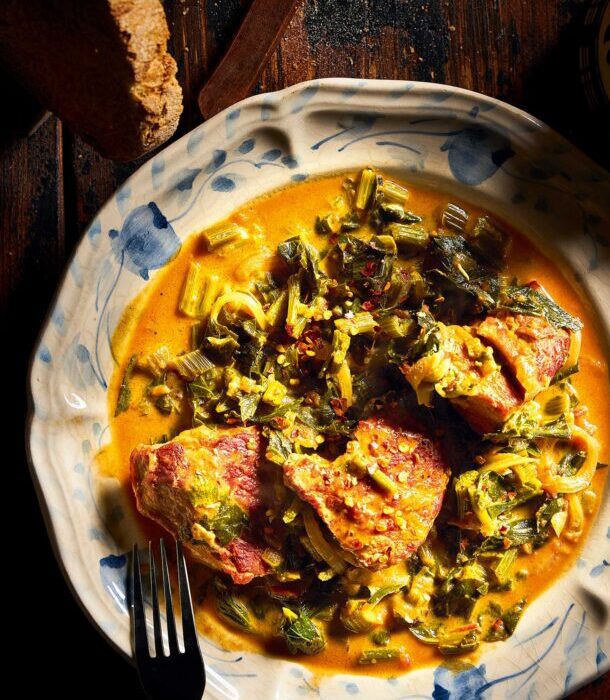 Χοιρινό με σέλινο, αυγολεμονάτο και κοκκινιστό, από τον Ταΰγετο