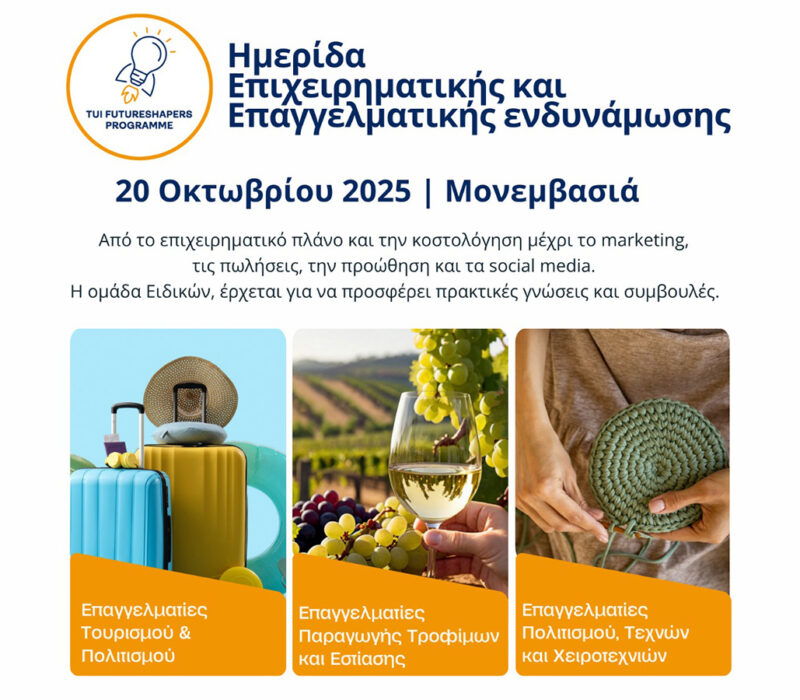 Η Wise Greece, με την υποστήριξη του TUI Care Foundation και σε συνεργασία με το Peloponnese Tourism Academy της Περιφέρειας Πελοποννήσου και τον Δήμο Μονεμβασίας, σας προσκαλεί στην Ημερίδα Επιχειρηματικής και Επαγγελματικής Ενδυνάμωσης – μια μοναδική ευκαιρία για επαγγελματίες ή επιχειρηματίες να ενισχύσουν τις γνώσεις και τις