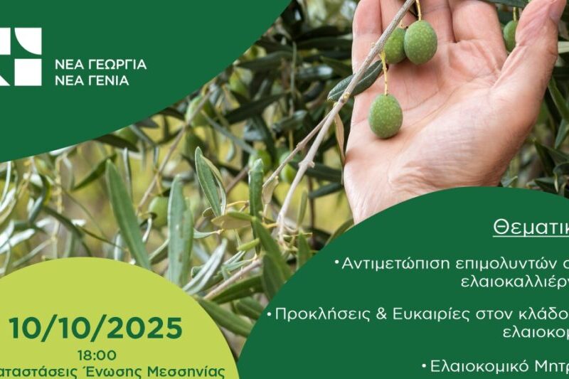 Με μια πλούσια σε περιεχόμενο Τελική Εκδήλωση, ολοκληρώνεται το πρόγραμμα «Ανοιχτή Ακαδημία Ελαιοκομίας – Μεσσηνία», σήμερα, στις 18:00, στις εγκαταστάσεις του Αγροτικού Συνεταιρισμού «Ένωση Μεσσηνίας» (Ε.Ο. Καλαμάτας – Τριπόλεως, Καλαμάτα 24100). Η εκδήλωση σηματοδοτεί την επιτυχή ολοκλήρωση του προγράμματος, που υλοποιήθηκε
