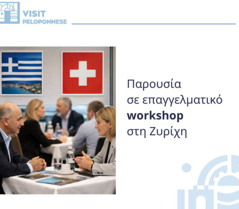Η Περιφέρεια Πελοποννήσου συμμετείχε σε επαγγελματικό B2B workshop τουρισμού στη Ζυρίχη, το οποίο διοργανώθηκε από την εταιρεία Respond on Demand Ltd, ενισχύοντας τη συστηματική παρουσία της στην ελβετική αγορά και αναπτύσσοντας νέες συνεργασίες με σημαντικούς εκπροσώπους του ταξιδιωτικού κλάδου. Η συμμετοχή