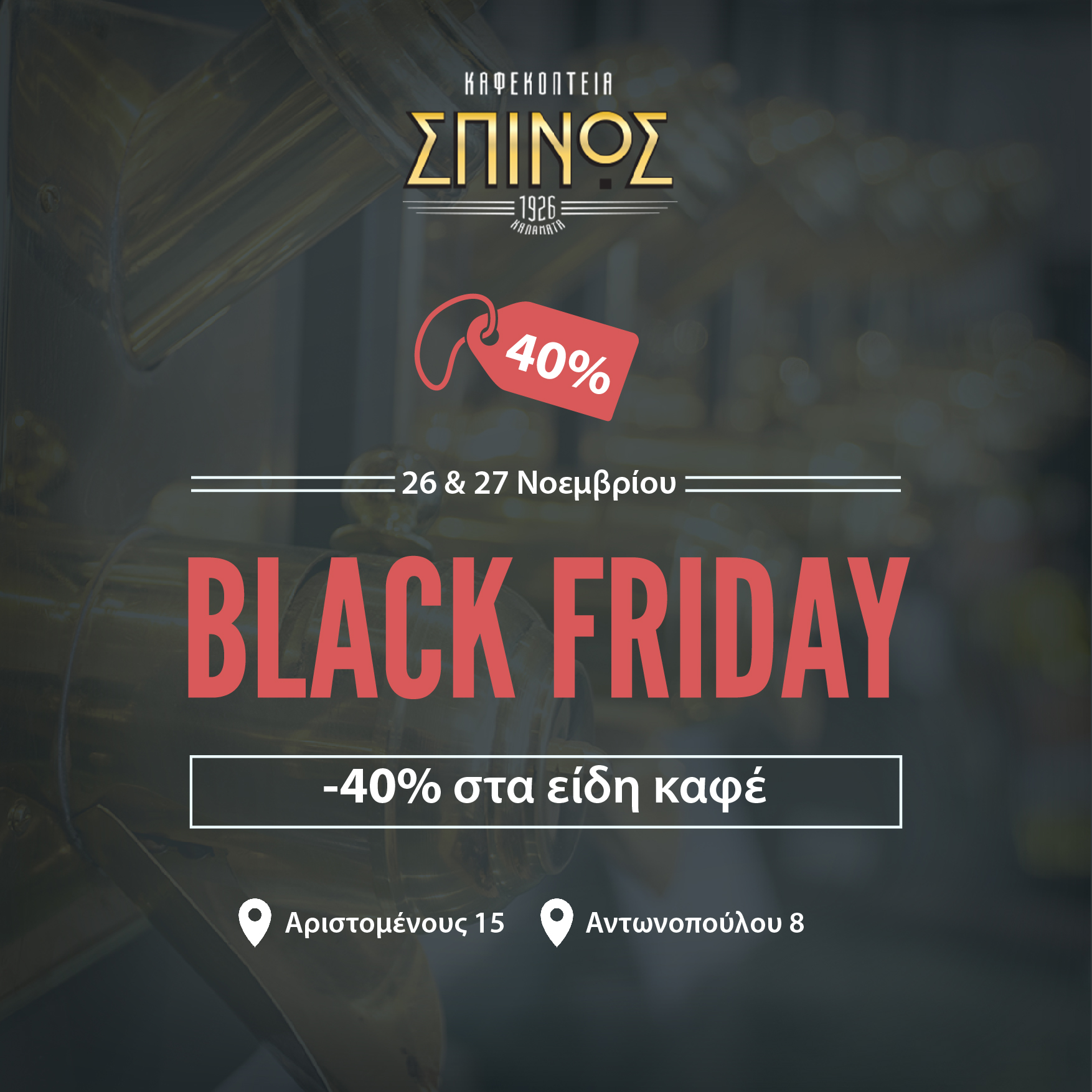 Τα Καφεκοπτεία Σπίνος γιορτάζουν τη Black Friday με 40% έκπτωση στα είδη καφέ. Για ακόμη μία χρονιά είμαστε έτοιμοι να υποδεχτούμε τους λάτρεις του καφέ με μεγάλες προσφορές!
